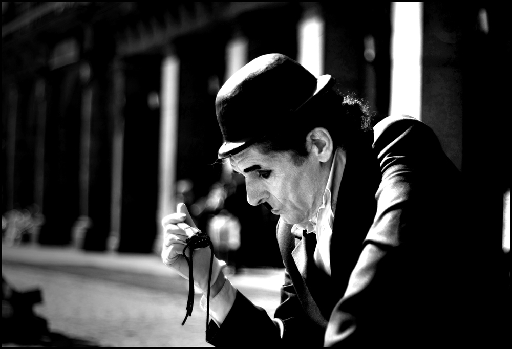 Io ti faccio i complimenti....bianco e nero molto belli, posa del mimo altrettanto, immedesimato al meglio nella dolce e triste maschera di Charlot. Lo sfondo non lo trovo fastidioso (forse forse una piccola croppatina a sx per togliere quella linea di luce).