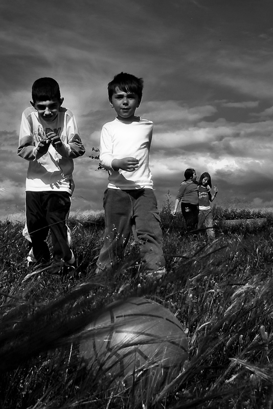 Curiosa poi l'espressione del bambino a sinistra che sembra avvicinarsi quatto quatto verso il recupero del pallone come se fosse andato a finire vicino a qualcosa di più pericoloso e come se avesse disturbato la tranquillità di qualcosa o qualcuno.