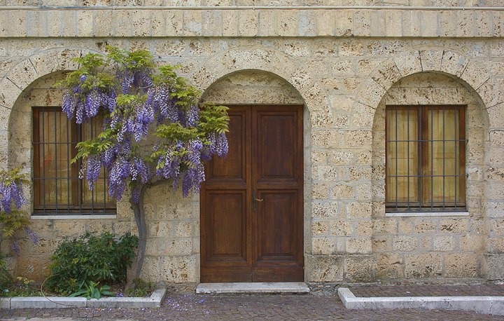 La foto disegna uno spazio abitativo gradevole, preciso, con la casa fatta di pietra di tufo e il glicine in fioritura primaverile nella aiuola accanto.