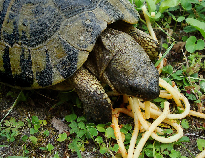 Divertente per lei no di certo.. occhio a dargli la pasta, le tartarughe metabolizzano molto difficilmente i carboidrati (in particolare le erbivore) che costituiscono un grosso peso da smaltire per il suo organismo.. meglio una carota o due foglie di lattuga fresca