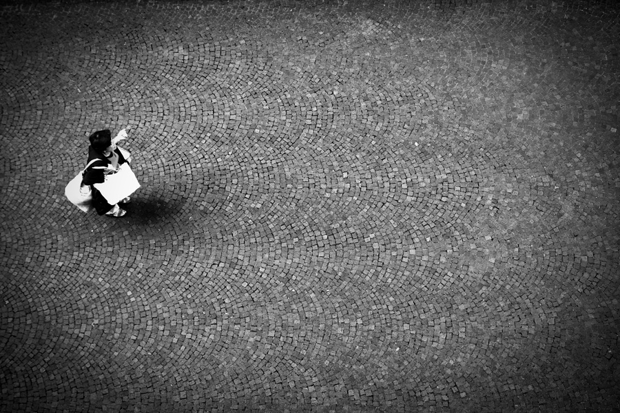 Vignettatura, titolo e bruciatura della borsa accompagnano troppo l'osservatore, come a voler dir troppo, come a volerlo dire troppo ad alta voce. Ne esce uno scatto ridimensionato nella portata e un po' convenzionale nella forma, dove si sente molto una certa accoppiata tra simmetria della scena e posizione del punto di ripresa, facendone risultare un appiattimento che non convince del tutto. Peccato, perché i giochi di sfumature descritti dalle linee della pavimentazione l'avrebbero resa danzante, quella donna, sospesa in un mondo di curve sinuose e ripetitive che una focale più corta o un punto di ripresa col piano della pellicola meno parallelo al terreno avrebbero forse ampliato nella geometria e nella portata, senza il bisogno di titoli che bruciano irrimediabilmente potenzialità espressive non comuni. Ne resta un buono spunto su cui lavorare, partendo proprio magari dalla titolazione della foto, che fa molto (e male).