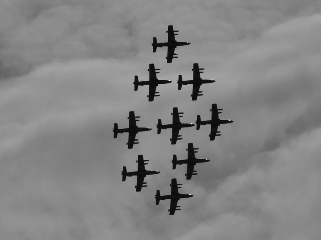 Secondo me ruotando il tutto di 90° in senso antiorario la composizione guadagna di dinamismo. A parte questa che può essere una considerazione soggettiva ti dico che manca un po' nitidezza che ti sarebbe facile dare aggiungendo un po' di maschera di contrasto. Secondo me anche rendere il cielo un po' più drammatico può aggiungere valore oltre a far spiccare meglio i velivoli. Ti allego una mia versione per farti capire meglio Smile