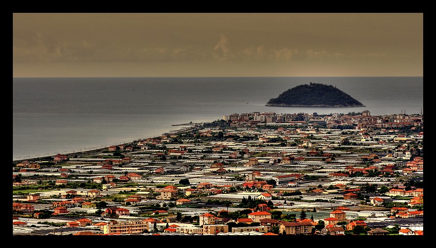 Albenga (con la piana densa di casette e serre) e l'isola della Gallinara.