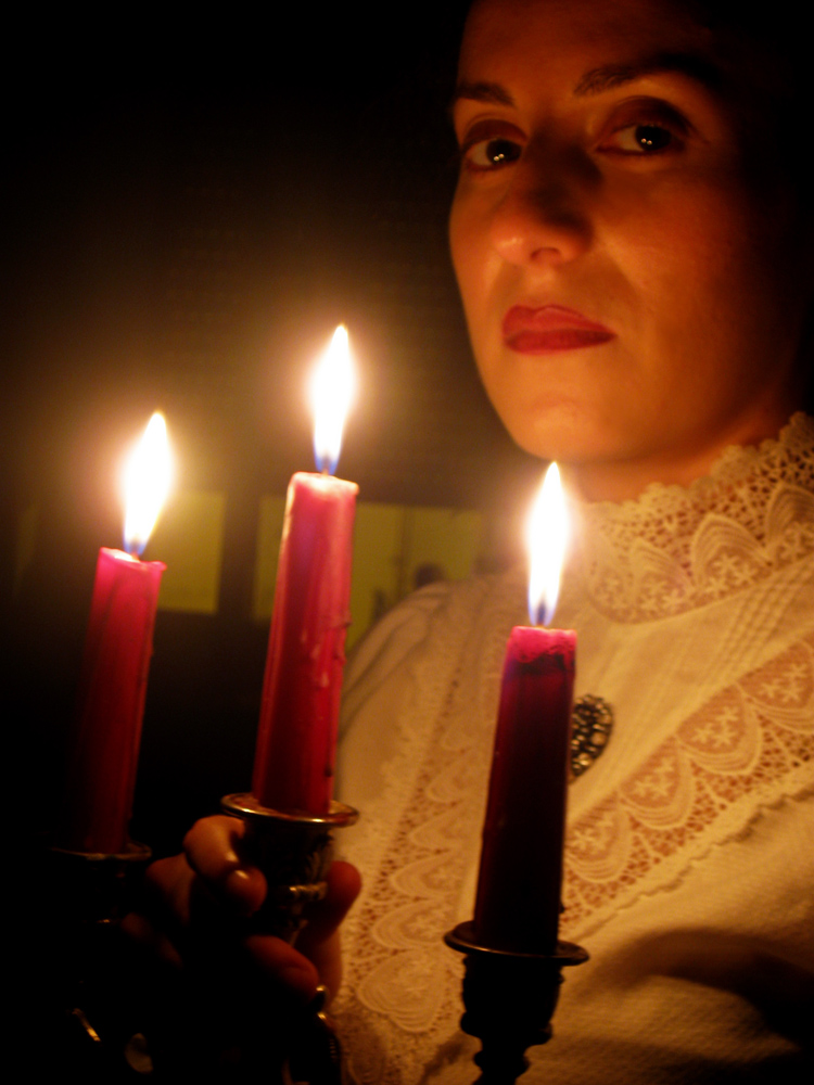 Del ritratto mi piace molto il riflesso della luce delle candele sul viso, le labbra perfettamente disegnate dal rossetto (una cura di sé che forse indica anche una certa freddezza) e quell'espressione degli occhi con le sopracciglia lievemente sollevate, davvero molto anglosassone: di una che esprime impercettibilmente il disappunto per la fotografia che le stanno facendo.
