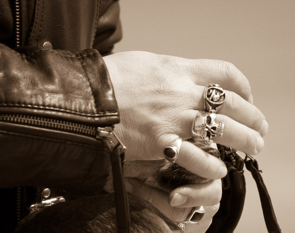 un amico biker con la passione per gli anelli di dubbio gusto "maneggia" un povero cagnolino :-p