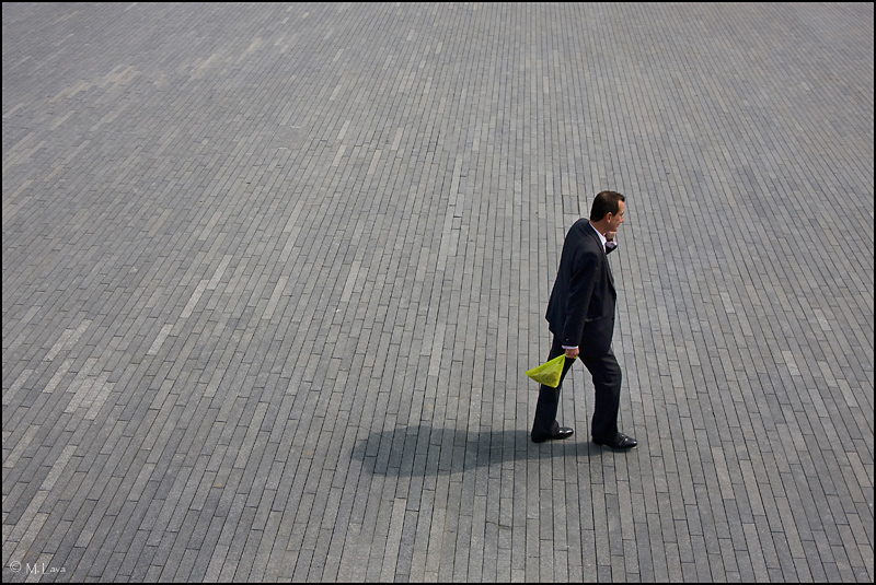 L'immagine la vedo un pò ermetica come contenuto, giocata molto sulla veste grafica, la texture della pavimentazione è opprimente, il soggetto sembra che ne abbia quasi timore, la sua posizione all'interno del fotogramma può essere letta anche come un forte desiderio di uscire, di andare via, faccio fatica a vederla sul lato ironico come suggerisce il titolo...l'agente Smith preferisco ricordarlo nel famoso monologo: http://www.youtube.com/watch?v=CwDACnPjxjY&feature=related  |
