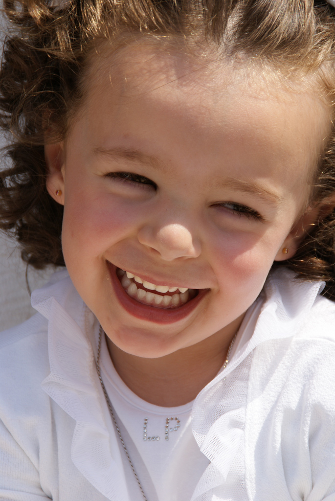 Presumendo che la piccola sia tua figlia le prossime volte cerca di posizionarla in modo tale che il Sole non gli dia fastidio, così potrà tenere gli occhi più aperti (che sono pure i luoghi dove occorre mettere a fuoco).