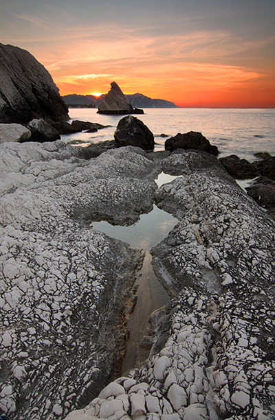 fino ad arrivare allo scoglio al centro ,davant al sole,molto bello il contrasto di tonalità quasi fredde in pp,cadissime sullo sfondo..