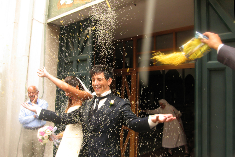 Buona la prima Liliana, ottimo il gesto colto degli sposi che con molta gioia e naturalezza accolgono la pioggia di riso.