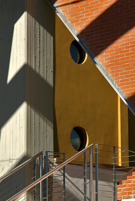 Sicuramente, era uno scatto difficile, da rendere nel genere più classico del termine 'architettonico', per via delle tante linee e dei tanti volumi che, inevitabilmente, si sovrappongono e si intersecano sulla scena.. E' un ottima scelta, comunque, quella del taglio verticale, che ha accompagnato tutte le linee principali e i volumi portanti della scena, come quel pilastro a lato e i due oblo che si sviluppano seguendo l'altezza della scena.. Ottima la scelta di lasciare tutto a colori, in questo caso: hai conservato la sensazione dei materiali e della temperatura di ogni singolo elemento, dal freddo del metallo della scala al caldo di quei mattoncini rossi sul muro..
