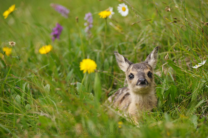 Complimenti per l'occasione e per l'immagine, il colore dei fiori da quel tocco in piu', un pò anche la fortuna di trovarlo nell'erba bassa ....non è molto preoccupato perchè ha la testa sollevata, altrimenti l'istinto sarebbe accucciarsi, (x 2 settimane dalla nascita) o forse è stata la pazienza di aspettare?..oramai siamo agli sgoccioli del periodo..