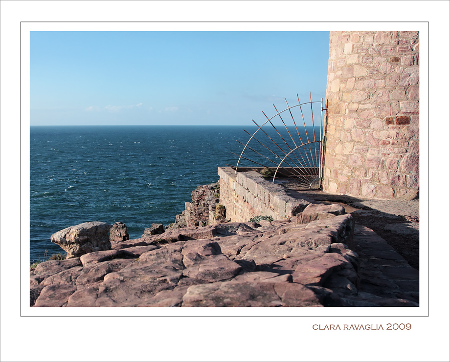 Se vogliamo, la linea di confine, così concretamente rappresentata dall'arco della grata, riguarda elementi sostanziali, come il contrasto fra la consistenza delle rocce e la crescente leggerezza di mare e cielo e quello cromatico fra toni caldi e freddi, ma anche simbolici, come l'attesa della comparsa dell'altro, del nemico forse, che ci viene suggerita dalla posizione della torre, a fronteggiare l'ignoto marino.