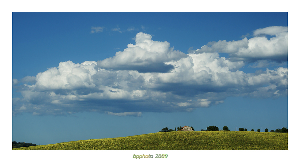 Nuvola incombente che sembra schiacciare il casale, ottimo effetto, mi piace.