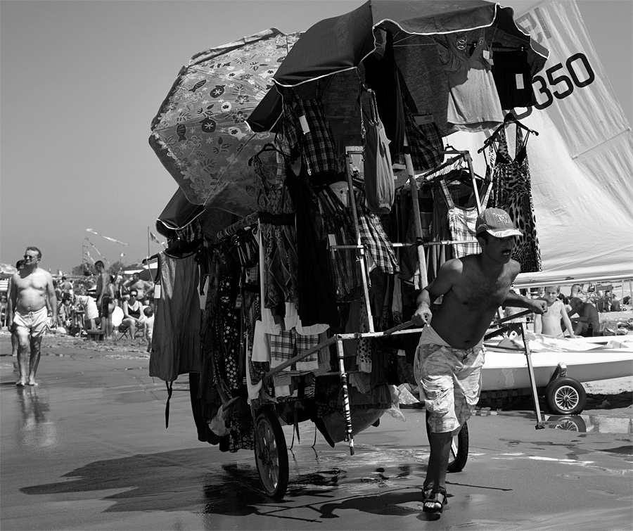 Mi piace lo scatto Dpe81: hai fermato un buon momento. La composizione è abbastanza buona. Forse avrei escluso il turista sulla sinistra del fotogramma che guarda fuori ed avrei fermato il carretto un passo prima. Ci presenti il duro e dignitoso lavoro di questo personaggio singolare con la sua ingegnosa e pittoresca bancarella contrapponendolo ai momenti di svago e relax tipici del periodo estivo. Lo sforzo fisico e l'impegno dipinto nel volto del personaggio contrastano con le posture rilassate e l'atteggiamenti di ozio delle persone in vacanza. Ma la chicca è lo sguardo curioso del bambino sulla destra del fotogramma nascosto dietro la barca a vela, che guarda curioso questo personaggio ed il suo incedere faticoso.