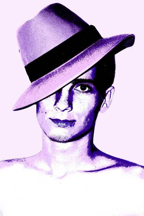 questo tuo ritratto alla Andy Wharol mi sembra ben studiato : mi piace particolarmente la diagonale richiamata dal cappello. Bello il viraggio in viola.