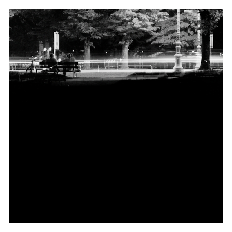 Gli elementi naturali come gl'alberi e quelli urbani (vedi i lampioni) posizionati nel fondale, ritmano una prospettiva paragonabile a uno scenario teatrale. Nel punto dove si situerebbe la scena, sulla panchina ci sono quei due personaggi...quel nero dovrebbe far prevalere lo spazio, l'insieme compositivo è determinato da un fattore aleatorio, riprendi i procedimenti che permettono la messa in opera, grazie alla prospettiva, di una forma simbolica del tempo e ne rovesci la logica.