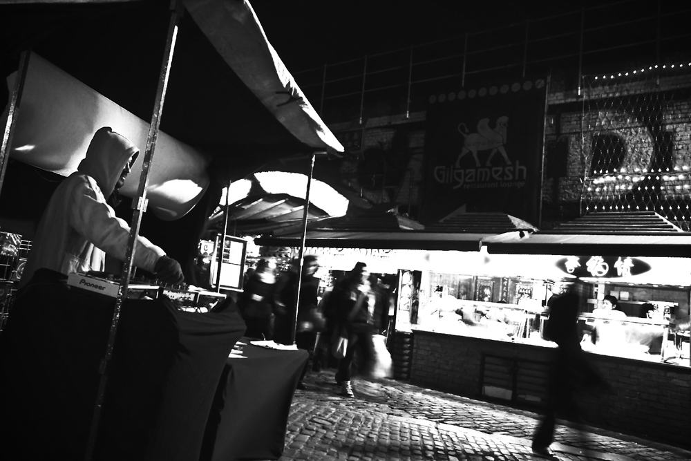 Il personaggio alla sinistra decide quale dev'essere la nostra colonna sonora, mentre tutto intorno a lui scorre velocemente, vedi il movimento dei passanti o vive nell'effimero vedi la forte luce con cui riprendi i commessi dei negozi, il tuo dj sembra la versione moderna di quei personaggi dei film di Frank Capra, il classico barbone felice presente all'angolo delle strade che con il suo carretto suonava sempre delle musichette allegre