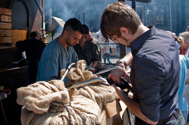 i sacchi di juta nascondono i classici bidoncini di Senape (Senf) tipici dei venditori di Bratwurst tedeschi, ammetto che non e' facile da capire |