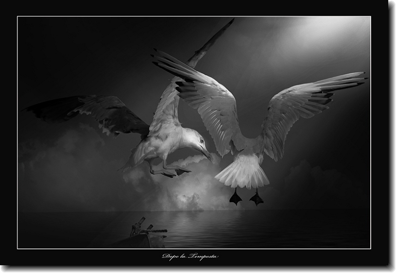 Comunque trovo buona l'idea che permea lo scatto.. con il volo potente di due gabbiani verso quei nuvoloni, che forse ancora più carichi e minacciosi avrebbero dato meglio l'idea della tempesta appena passata..  _________________ [size=10]Maurizio - Sono Qui Per Imparare.. |