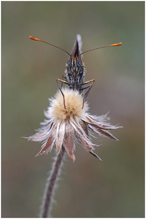 Un bel primo piano di questa farfalla su un posatoio fantastico. Gradevole lo sfondo. Forse un pò di luce sugli occhi con un pannello riflettente.