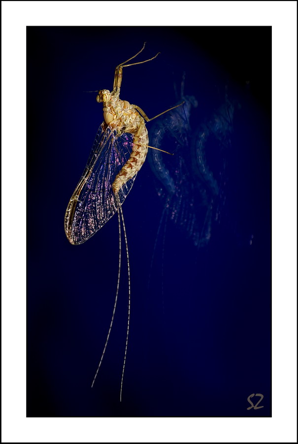 Ieri a casa un pò prima di uscire per andare al lavoro, ho scorto sui vetri della finestra questo minuscolo insetto, incuriosito ho voluto provare a fotografarlo, per vederlo ingrandito, è per quello che ci sono i doppi riflessi, l'effimera si trovava come si vede in verticale, mi sembrava brutto girarla, con i riflessi sdoppiati la giudico una posizione più naturale così, comunque grazie per le osservazioni.