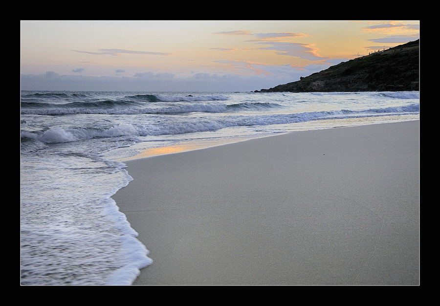 Il cromatismo tendenzialmente freddo del mare beneficia dell'intrusione calda del riflesso ripresa e ribadita dalle delicate cromie del cielo.