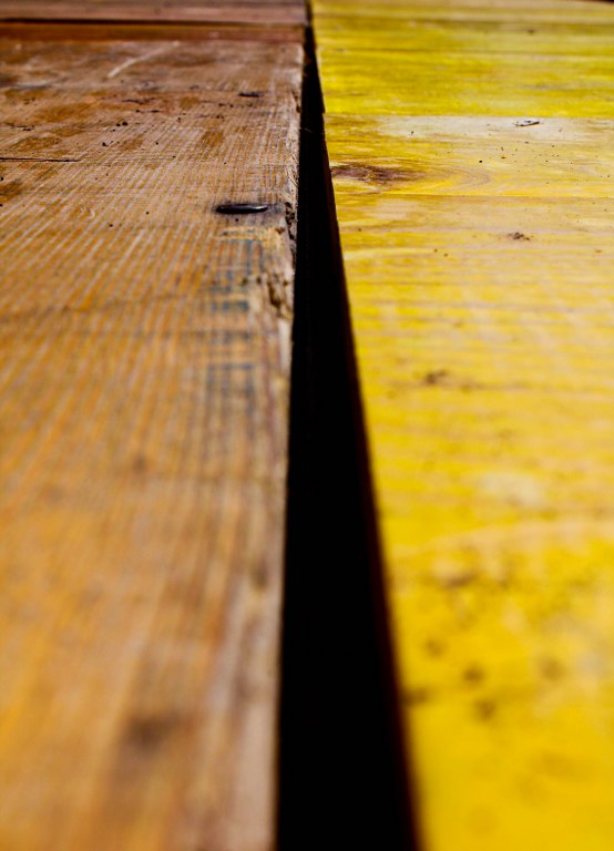 Ciao. L'idea c'è, ma voglio farti notare alcuni accorgimenti che potevano rendere lo scatto migliore di come si presenta. Guardando la parte in basso si vede che la parte a sinistra è maggiore della destra, per cui significa che non ti sei messa perfettamente in asse con la fessura fra le due assi che la linea portante e significativa di tutto il fotogramma. Hai scelto di mettere a fuoco dove si vede la capocchia del chido, punto significativo, senz'altro, ma troppo distante, infatti la parte in primo piano risulta parecchio sfuocata e rappresenta una zona troppo estesa del fotogramma. In alto a destra si vede un angolino di nero che non chiude il fotogramma col giallo dominante dell'asse da quella parte, potevi rifilareun pochino.