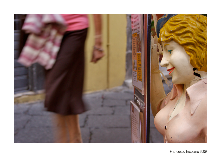 Simpatica...però mi chiedo: perché non aspettare il passaggio di un soggetto maschile? Il messaggio è altamente allusivo , il manichino (se non fosse che s'intravede troppo bene la mano destra che regge la locandina di qualche menù di ristorante ) sembra ammiccare i passanti e la loro bellezza, magari a trovar il modo di riuscire a contestualizzarla meglio, cercando di eliminare quel braccio che banalizza una scena promettente...