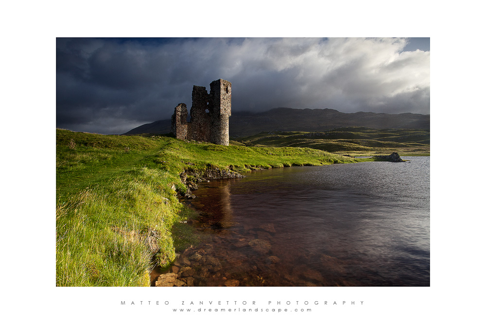 ben ripresa la bella luce che lambisce il prato ed il rudere del castello e disegna le ondulazioni delle pendici del monte, valorizzata dall'addensarsi di nuvole minacciose che oscurano le cime.