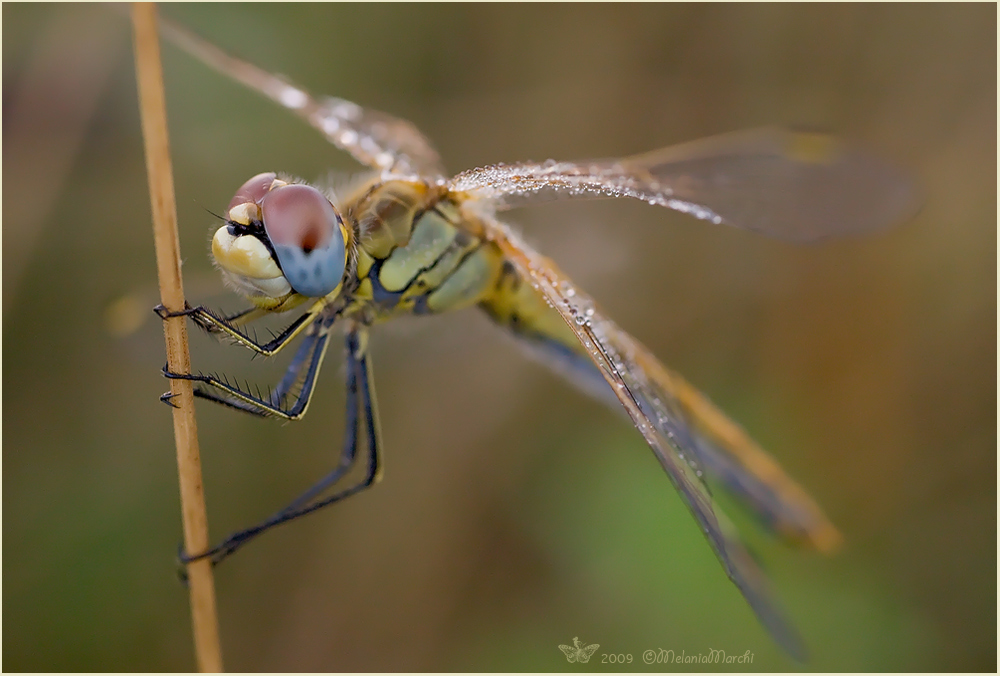 Bella immagine della libellula. Maf precisa sulla testa e zampe con lo sfocato della coda che si perde molto bene nello sfondo.