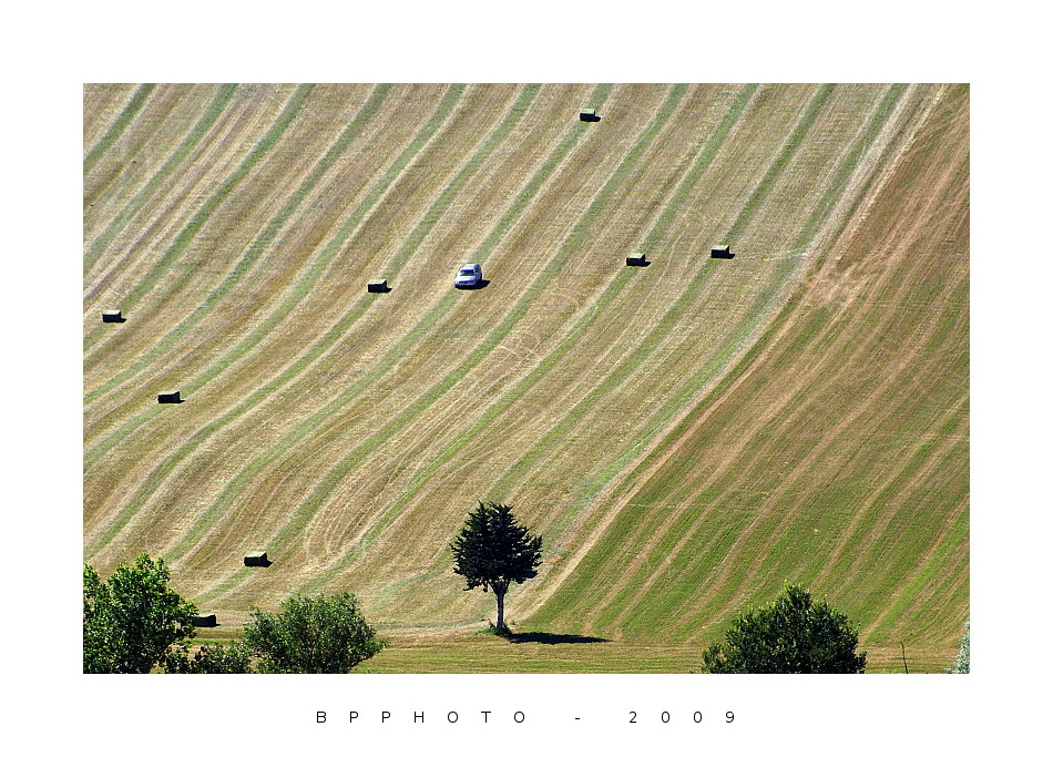da un carattere di originalità a questa bella fotografia campestre con un'ottima compsizione ed un bel grafismo. I piani sono schiacciati dal teleobiettivo, tanto che si ha la sensazione che le balle di fieno e l'auto siano appese.