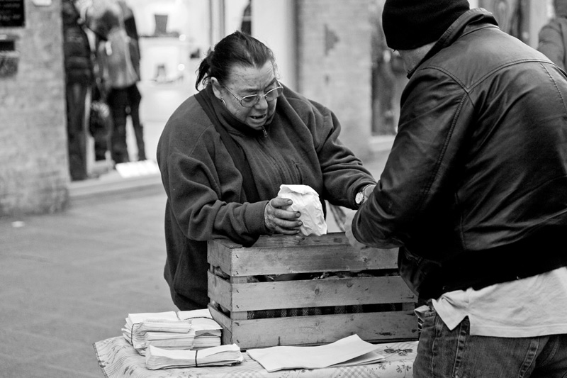 Mi piace per l'espressione della signora, se anche il volto del venditore fosse stato visibile, mi sarebbe piaciuta di più.
