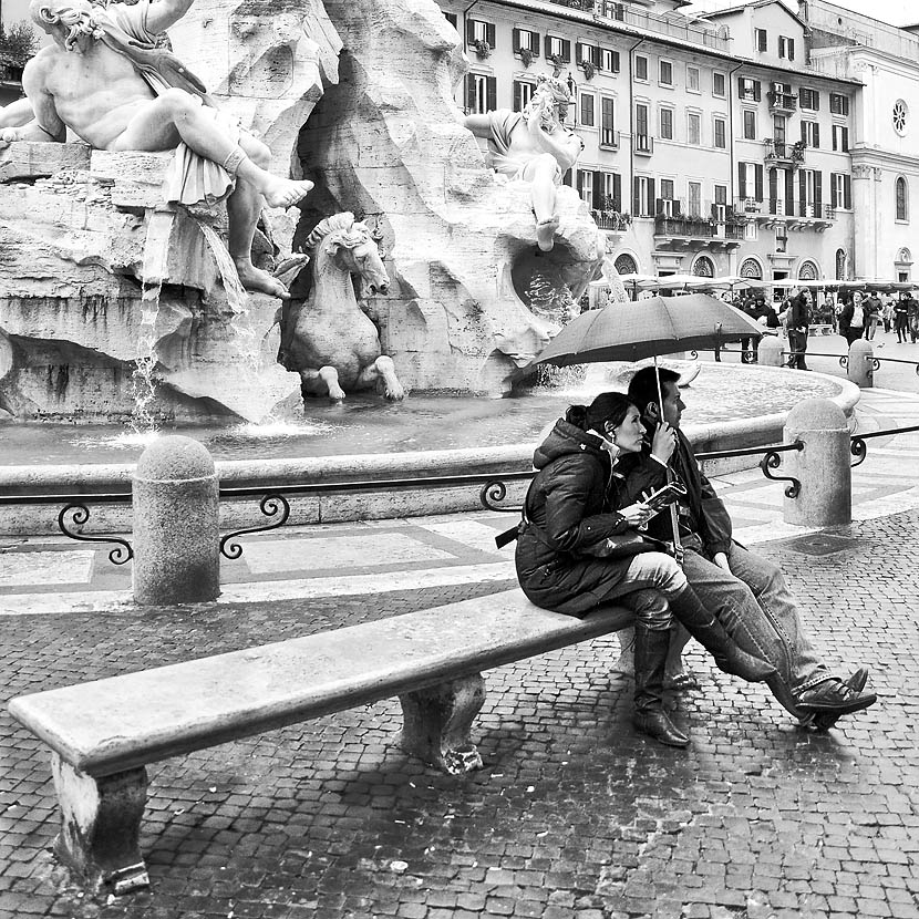 una buona scenetta, con tanto di statua osservante che mima la posizione ottimale per stare seduti, incurante della pioggia o forse per attirare l'attenzione dei due soggetti, facendo loro un pò il verso