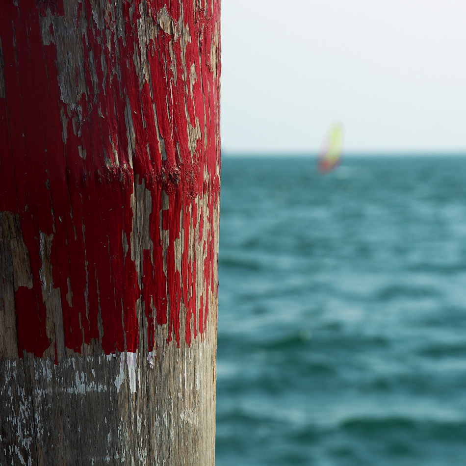 qui la vela è sfocata e pare passare in secondo piano rispetto al colorato e invadente palo sulla destra....dico pare...perchè così non è....infatti l'occhio rincorre quella figura sfuocata fino a che non riesce ad identificarla dandogli prima un nome, e poi successivamente (più diretto per gli appassionati...o forse solo per quelli) affiancandola al nome del luogo....ed il quadro si chiude.