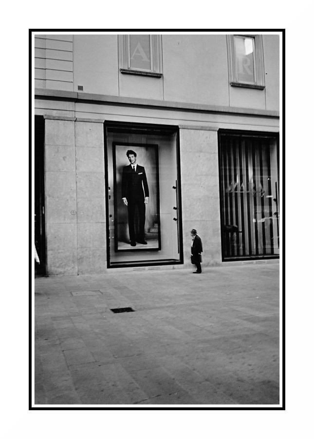 Qui il rigore formale era d'obbligo visto la mancanza di un momento particolarmente significativo e l'impostazione elegante dello scatto. Bravo ad aver fermato il tuo personaggio scuro contro lo sfondo chiaro del muro ma per lo stesso principio abbiamo un braccio chiaro che spunta dal margine sinistro del fotogramma. Il contrasto di proporzioni rappresenta un' idea interessante che sarebbe stata valorizzata da una maggiore simmetria compositiva. Da uno streepher come te chiediamo sempre di più...... Wink