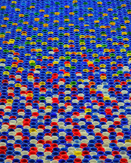La foto è costituita da una moltitudine di tappi da bottiglia di comune plastica e io non l'ho ripresa alla Biennale di Vnezia, bensì da una installazione che si trovava nella mia città in una mostra di autori locali che apprezzo molto, fra l'altro. Ho ritagliato così questa inquadratura da l' altezza d'uomo come trovandosi di fronte ad una passerella o un tappeto di tappi.