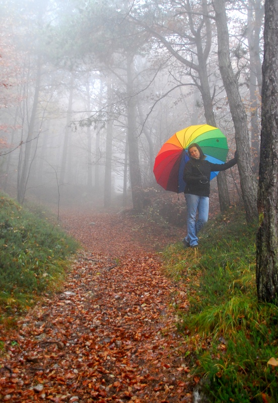 Volendo fare "giochi" di post-produzione (semplici), metterei tutto in biano e nero tranne l'ombrello, come scrive anche DavideV, ed il sentiero di foglie (che ha un bel colore)