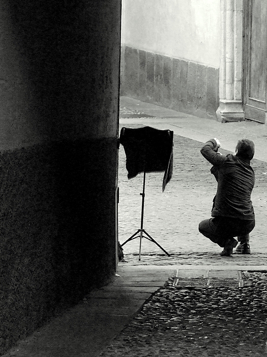 Ed è vero, la foto escudendo con una sapiente inquadratura, chiara e pulita, l'interno della piazzeta nascosta dal muro in primo piano interroga l'osservatore su cosa stia riprendendo così attentamente il fotografo della scena. Forse i disegni dello stendardo? Mah...