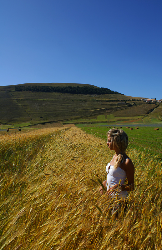 a questo punto taglierei un po di cielo, ottima la presenza della ragazza.. il colore dei suoi capelli richiama le spighe, questo luogo sembra si presti bene proverei altri scatti magari in ora diversa per avere una luce piu calda