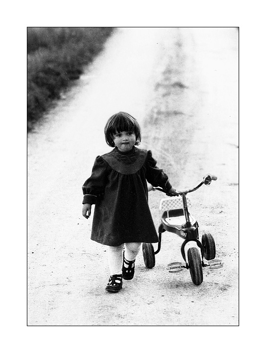 | Emozionanti questi tuoi passi a ritroso nel tempo, alla ricerca di una bimba che ora è già donna. Mi piace l'espressione della piccola e il suo trascinare l'amato triciclo, bello il bn.