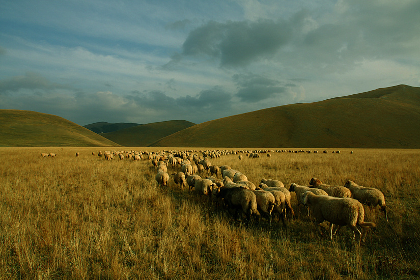 Bellissimo scatto. La disposizione delle pecore guida lo sguardo verso la valle all'orizzonte, le nuvole e le striature nel cielo combinate con la luce tenue e calda danno un tocco di drammaticità, la dominante giallognola non la trovo un problema, anzi a mio avviso da un tocco "old style" all'immagine.