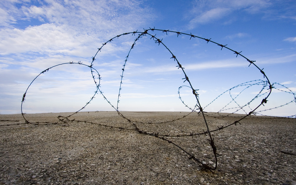 Una bella grandangolata che dà la giusta importanta a quel bel gioco di forme dato dal filo spinato. Mi piace molto damiano, peccato solo che ci sia un po' di aberrazione cromatica attorno al filo spinato sulla destra