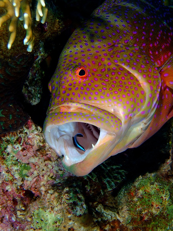 A grouper takes the time to care about his oral hygiene, with the collaboration of a cute small cleaner fish...