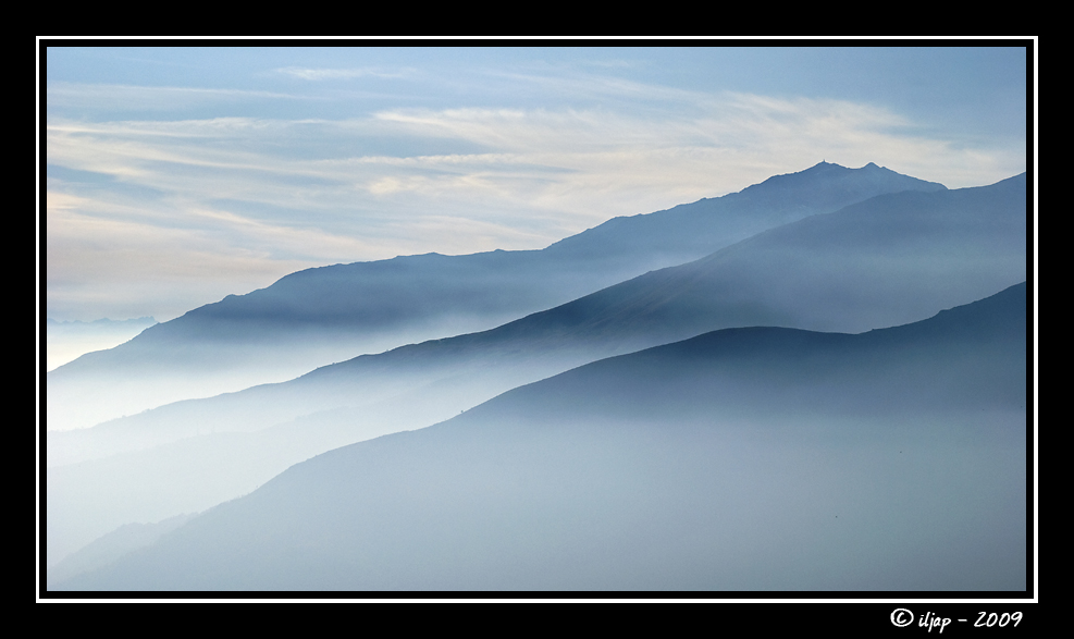 | Un classico, una festa di azzurri fra terra e cielo, un delizioso ordine costituito che si spiana come seta deliziosamente svolazzante davanti  ai nostri occhi. sarei curiosa di conoscere il file originale di partenza , o di sapere da te quanto contrasto hai aggiunto eventualmente in post ( dato il confine abbastanza netto in alcuni punti fra fasce bianche di nubi e oscurità dei monti) ma il risultato è notevole e la stratificazieon sicuramente veritiera.