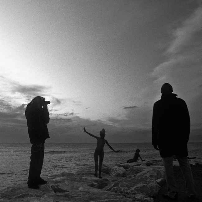 Molto onirico e estraniante l'accento visivo di questa foto fatta con un bainco e nero granoso e cupo che tende ancora ad aumentare maggiormente il contrasto psicologico e ambientale fra le bambine in costume da bagno e chi invece riprende e guarda vestiti già con abiti semi invernali.