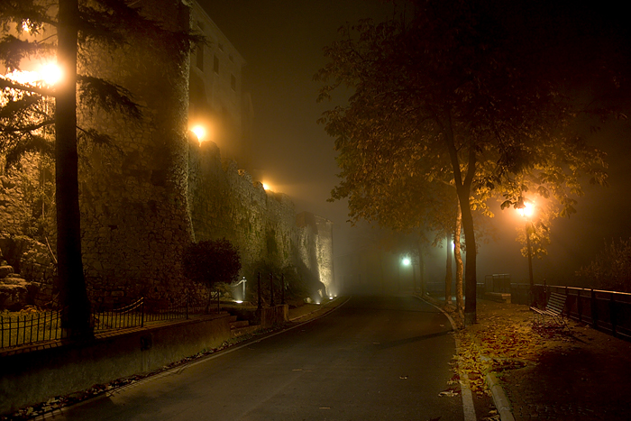 Quest'alito di nebbia in cui si perdono in distanza alberi e mura e luci crea un bellissimo effetto. Mi piace molto questa tua foto.