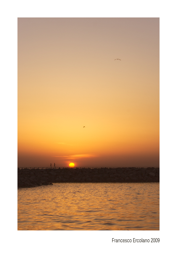 Composizione come già detto davvero molto attenta e ben studiata, in quei pochi attimi che portano a compimento uno scatto degno di nota. Mi piace la scelta della verticalizzazione, bilanciata dalla presenza importante quanto sobria dei volatili. Altrettanto interessante la presenza delle figure umane sul pontile, mentre il sole in quella posizione è davvero la ciliegina sulla torta. Ottima in tutto, anche a livello cromatico, le preziose e calde sfumature del cielo, che si specchiano a pelo d'acqua, rendono ancor più piacevole la lettura di questa foto, che non passa di certo inosservata.
