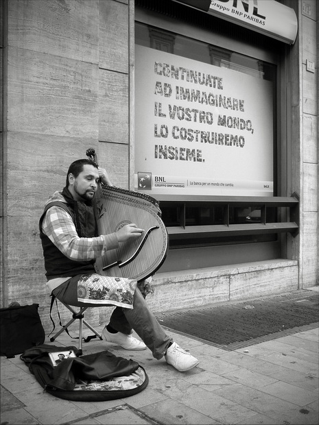 In mia difesa, dico subito che è il mio primo artista di strada! Ops A dire il vero, fotograficamente parlando, mi ha attirato prima la scritta dietro e poi il suonatore. E' stato come eseguire un compitino facile: l'unica parte difficile è stata riprendere questa espressione pseudosognante, rilassata (o almeno mi illudo di esserci riuscito) visto che il ragazzo suonava e cantava contemporaneamente (bella musica e bella voce!).