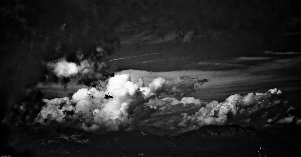 Parere personale naturalmente, mi sembra troppo scura e poco leggibile in alcuni punti, forse avredi ridotto ancor di più la visione sulla cima dei motni lasciando ancor più spazio al cielo magari schiarendo cercando di non bruciare di più quei nuvoloni bianchi già al limite