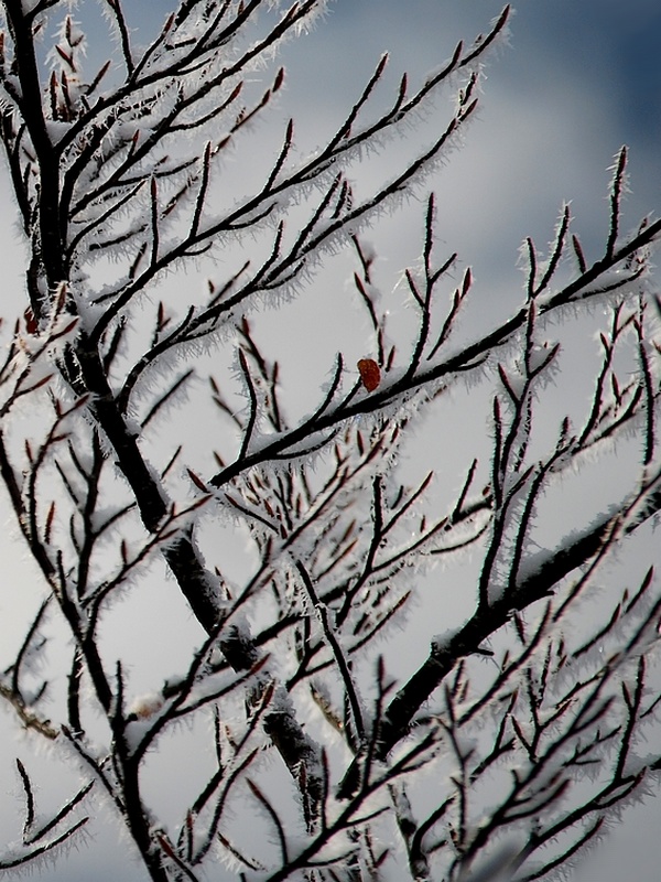 me l'aspetto centrata sulla fogliolina ma poi sembra rincorrersi tra i rametti gelidi...